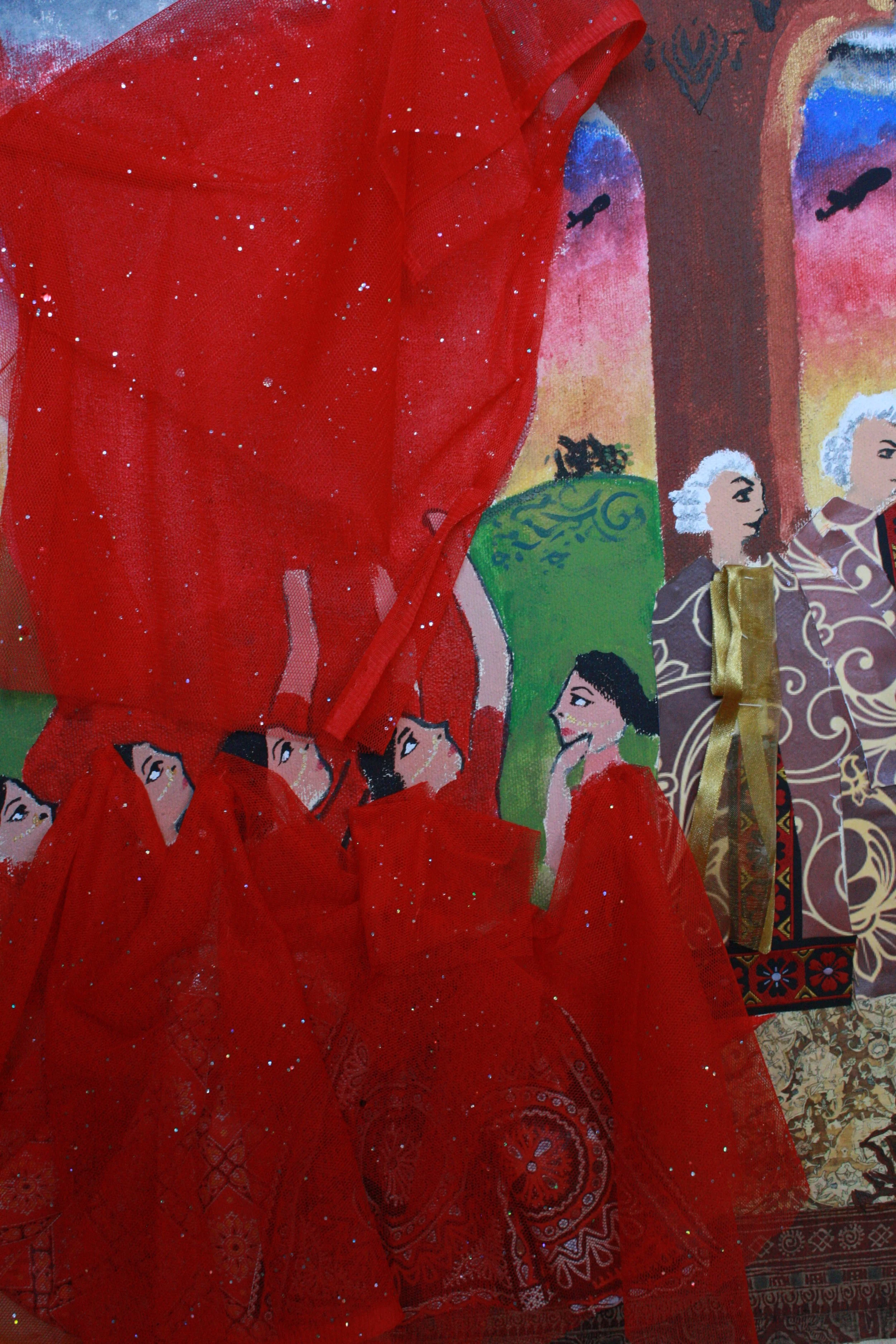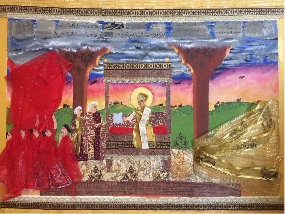 This work critiques the exploitative roots of the textile industry in the Indian Subcontinent, tracing its origins to an 1857 treaty that empowered the East India Company to establish industrial operations and initiate a historic textile trade with the Western world. The composition highlights the past and present: the setting sun, grey clouds, and surveillance drones evoke the enduring violence of colonialism and global capitalism. The foreground reenacts the treaty’s ceremonial cloth offering. Hand-stamped and stitched fabrics with traditional South Asian patterns like Paisley and Ajrak, anchor the piece in the region’s textile heritage. The work also speaks to the war, famine, and labor exploitation that accompanied this history.